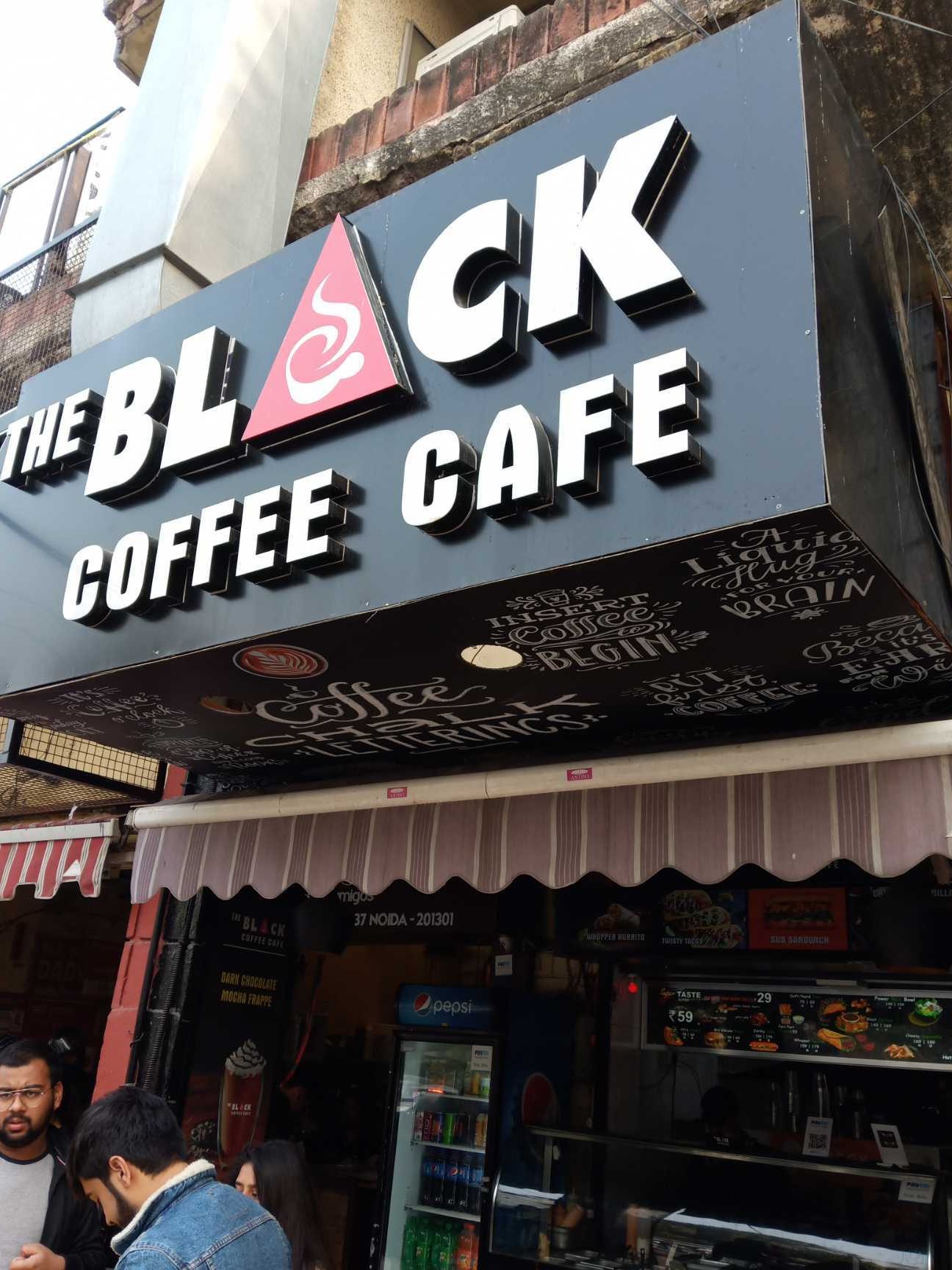 Where exactly is The Black Coffee Café located in Noida?